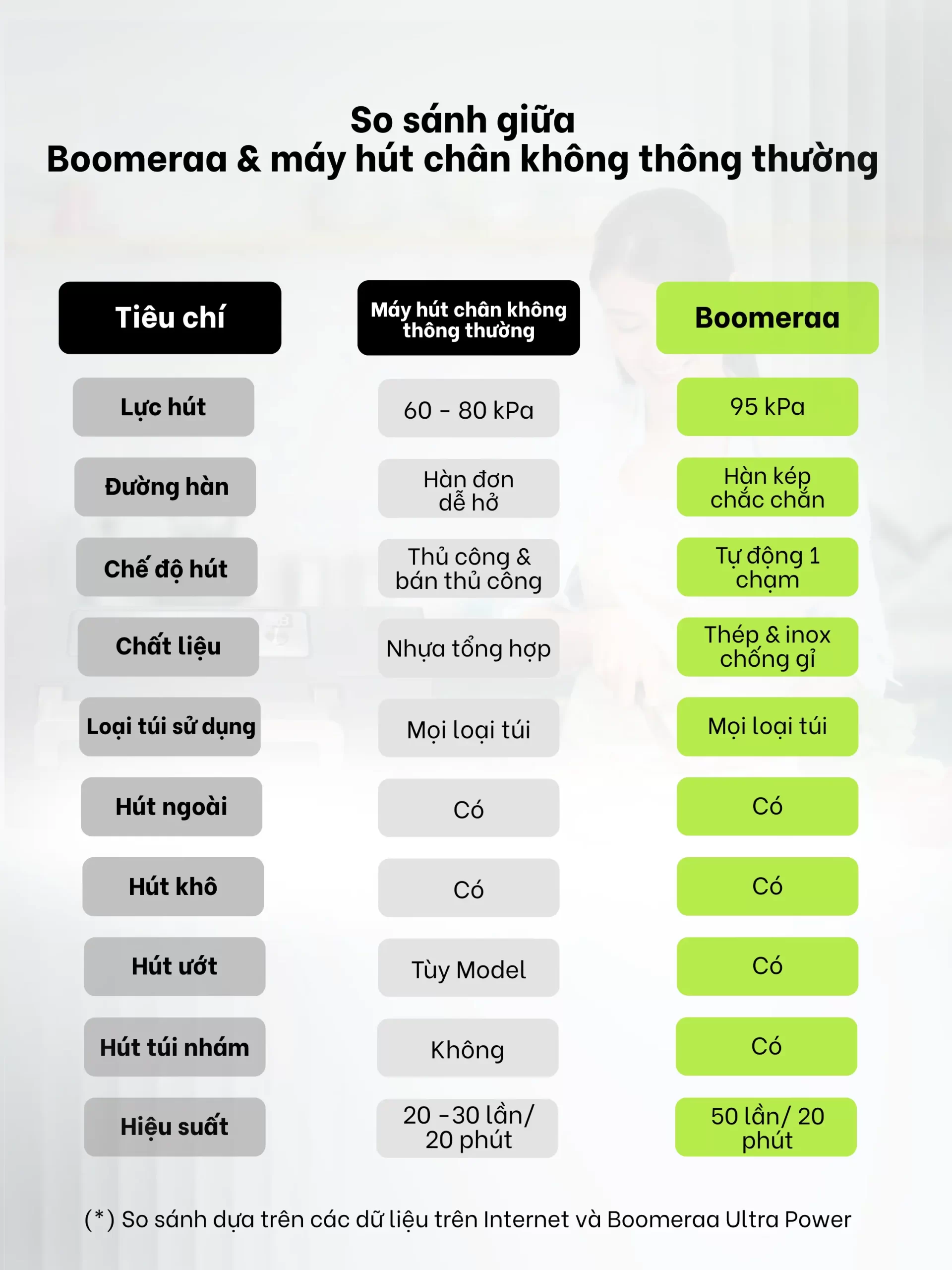 Boomeraa Ultra Power mang đến 4 chế độ linh hoạt: Hút khô, hút ướt, hút túi nhám, hút bình/ hộp; Giúp căn bếp của bạn gọn gàng và thực phẩm luôn tươi ngon.