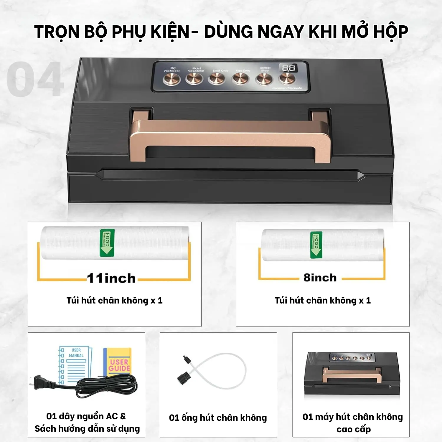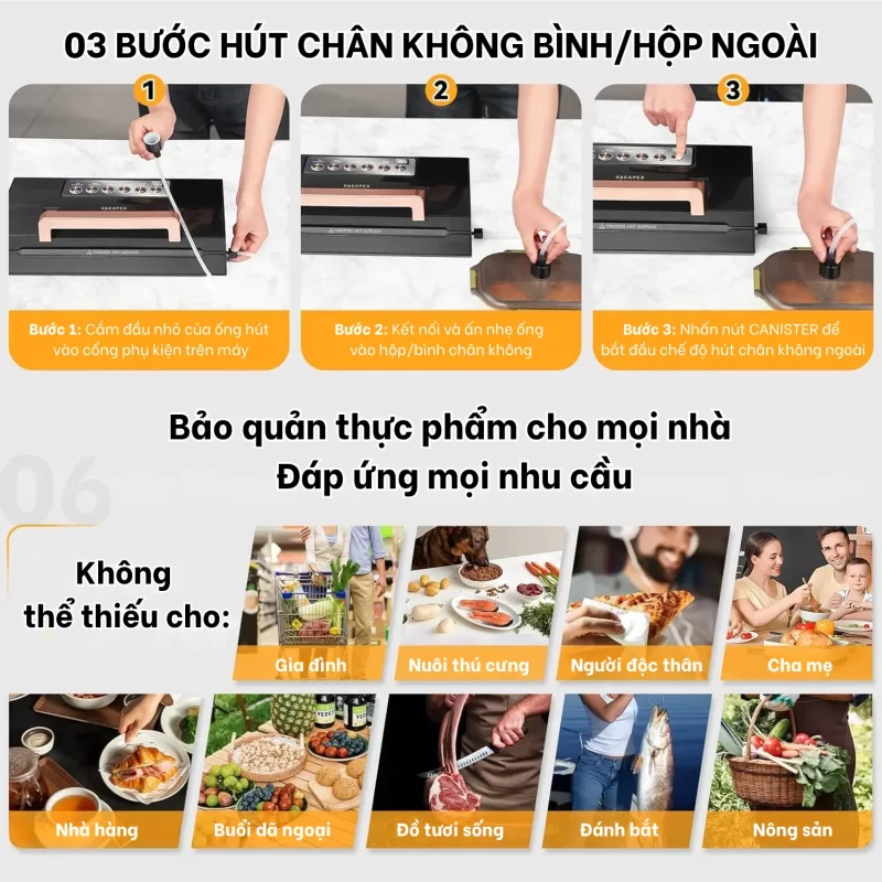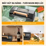 • Tương thích đa dạng kích cỡ túi – Hút hộp/bình: Hệ thống đầu nối thông minh cho phép hút chân không hộp, bình, túi nhiều size (lên đến 30cm) – phù hợp từ nhu cầu gia đình đến kinh doanh thực phẩm nhỏ.