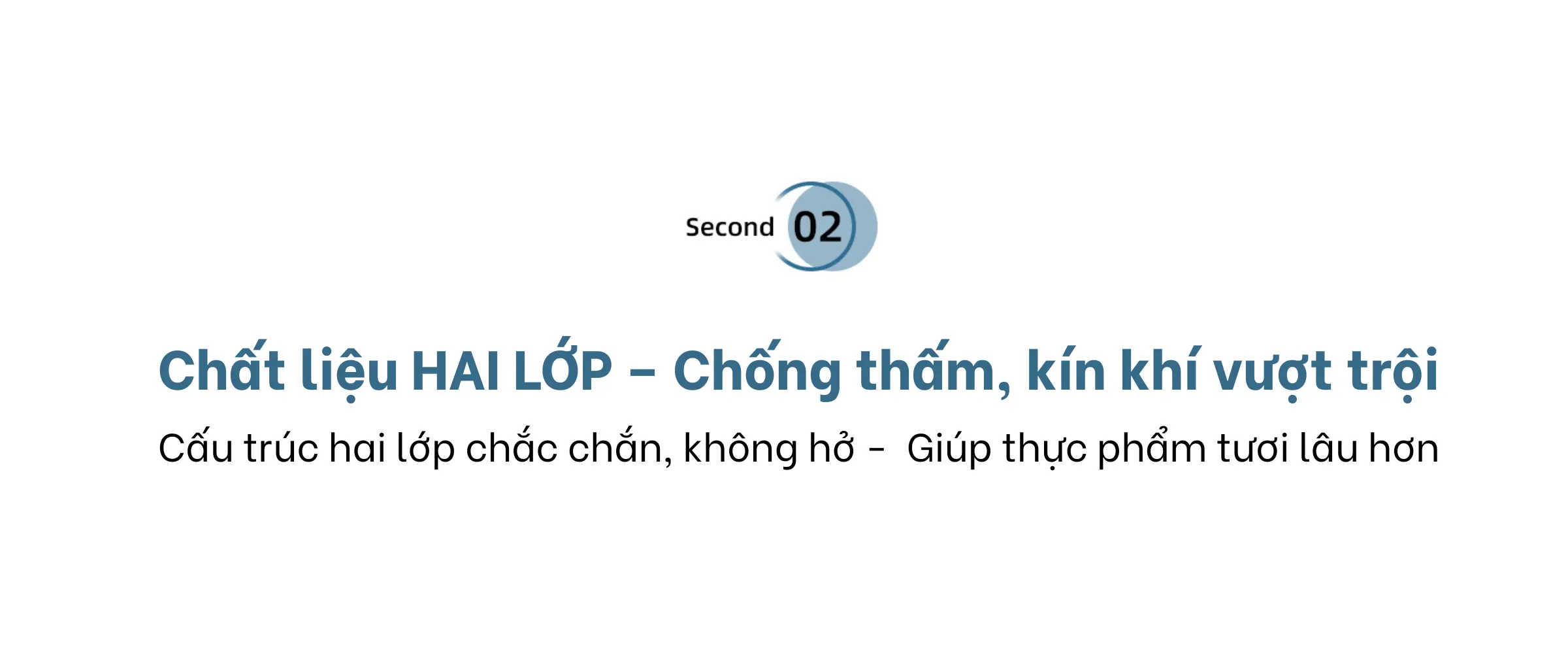 Chất liệu nhựa PE cao cấp, dày dặn, chịu nhiệt tốt, an toàn cho thực phẩm và có thể dùng bảo quản trong tủ lạnh, tủ đông hoặc luộc chín ở nhiệt độ cao. Giữ trọn vị tươi ngon – chống ẩm mốc, tiết kiệm không gian và thời gian bảo quản hiệu quả.