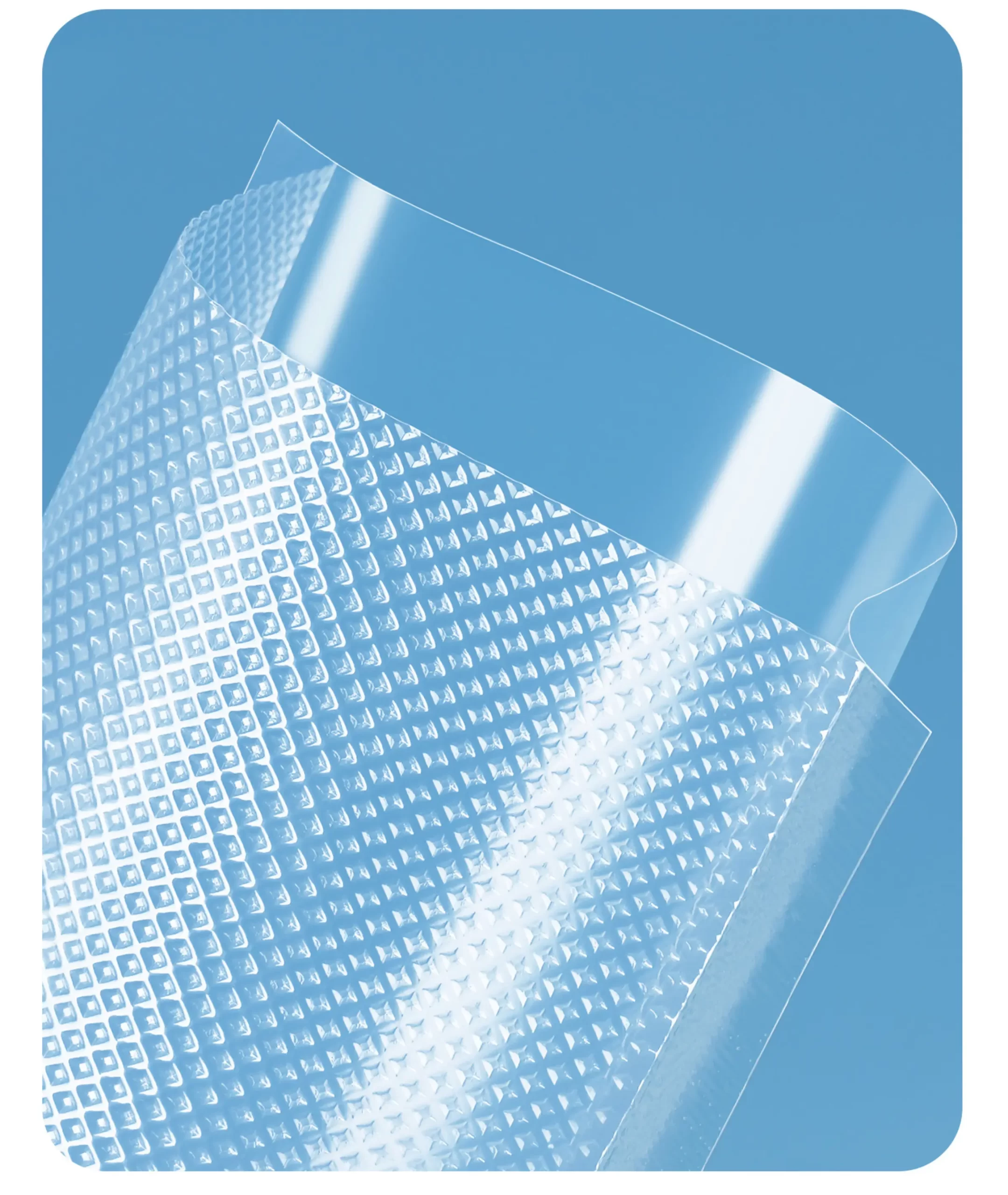 Túi hút chân không Boomeraa được thiết kế một mặt nhám – một mặt trơn, tạo đường dẫn khí tối ưu, giúp máy hút nhanh và mạnh. Nhờ cấu trúc đặc biệt này, không khí được loại bỏ triệt để, giúp thực phẩm được bảo quản trong môi trường chân không hoàn hảo, hạn chế tối đa quá trình oxi hóa và vi khuẩn phát triển.